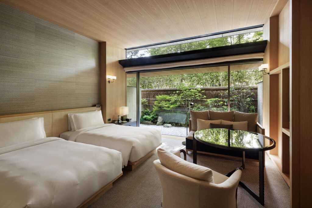 Les chambres du Park Hyatt Kyoto sont conçues comme des espaces de repos profondément apaisants, mêlant bois de tamo, cyprès japonais, textiles sobres, œuvres originales et vues qui évoluent avec la saison.