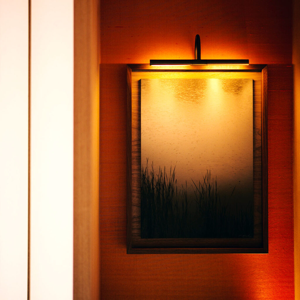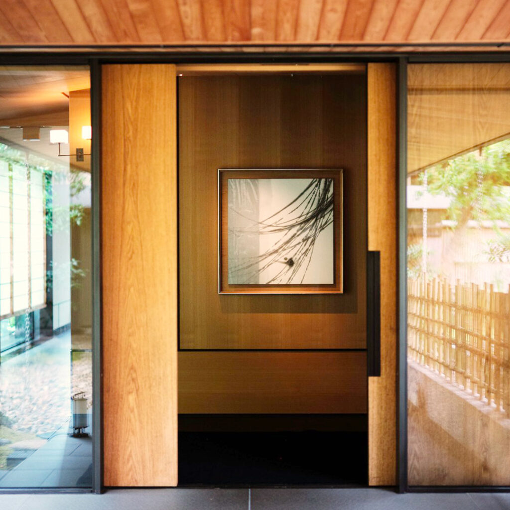 Les œuvres d’art présentes dans l’hôtel s’inscrivent dans la tradition spirituelle de Kyoto : peintures à l’encre sumi, sculptures en bois et en pierre, textiles indigo, pièces en bronze et en verre. Les créations d’artistes tels que Katsutomi Horiki, Fabrizio Corneli ou Toko Shinoda mettent en valeur l’esthétique wabi-sabi et renforcent l’idée que l’art ici n’est jamais décoratif, mais profondément ancré dans le lieu.